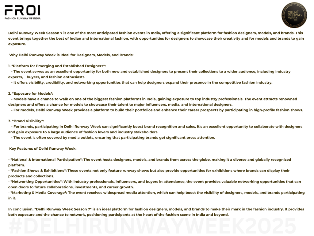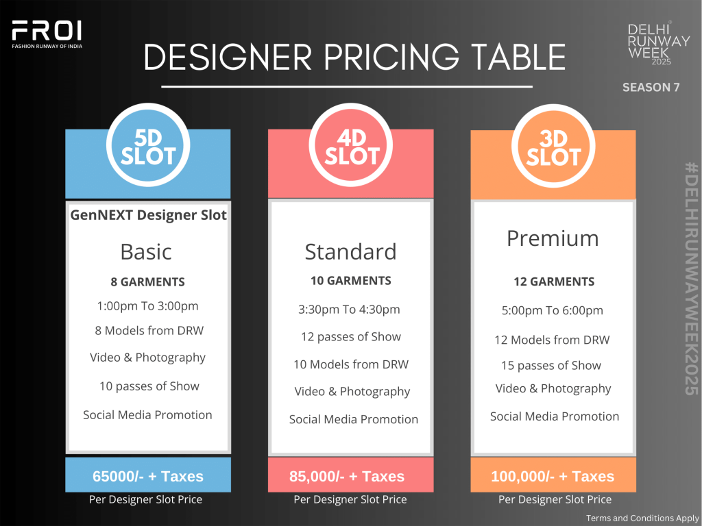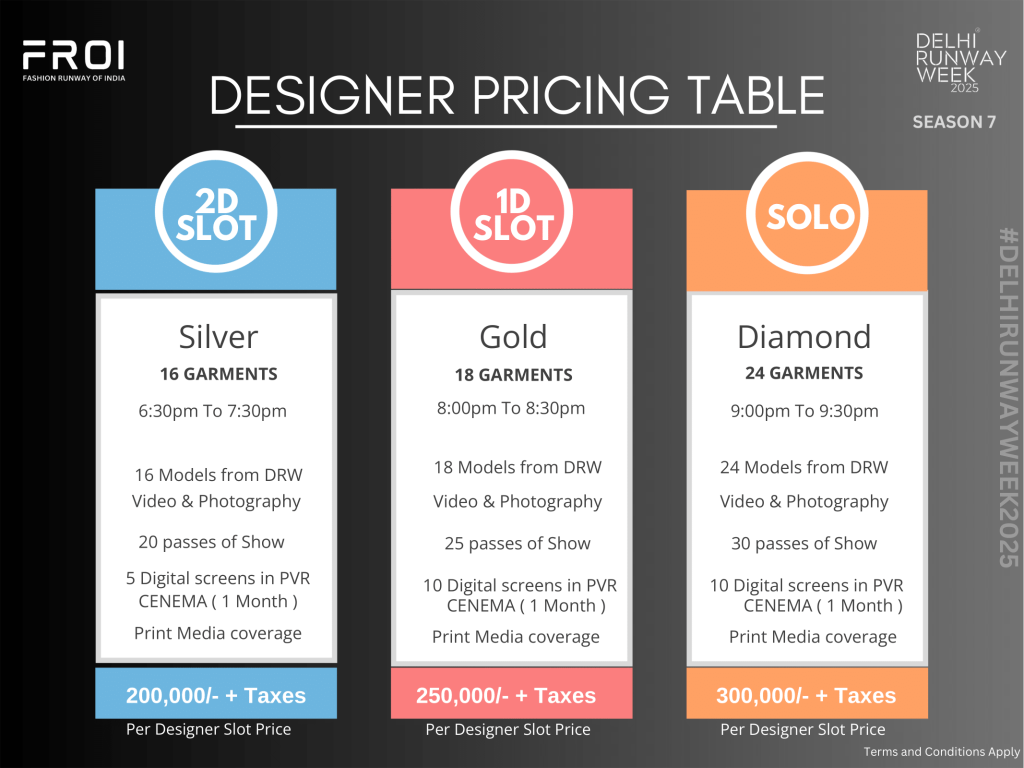 At Fashion Runway of India, we offer a range of exclusive packages designed to provide the ultimate fashion experience. Whether you’re a designer looking to showcase your latest collection, a brand seeking to engage with a diverse audience, or a fashion enthusiast eager to immerse yourself in the glamour of the runway, we have a package tailored just for you.